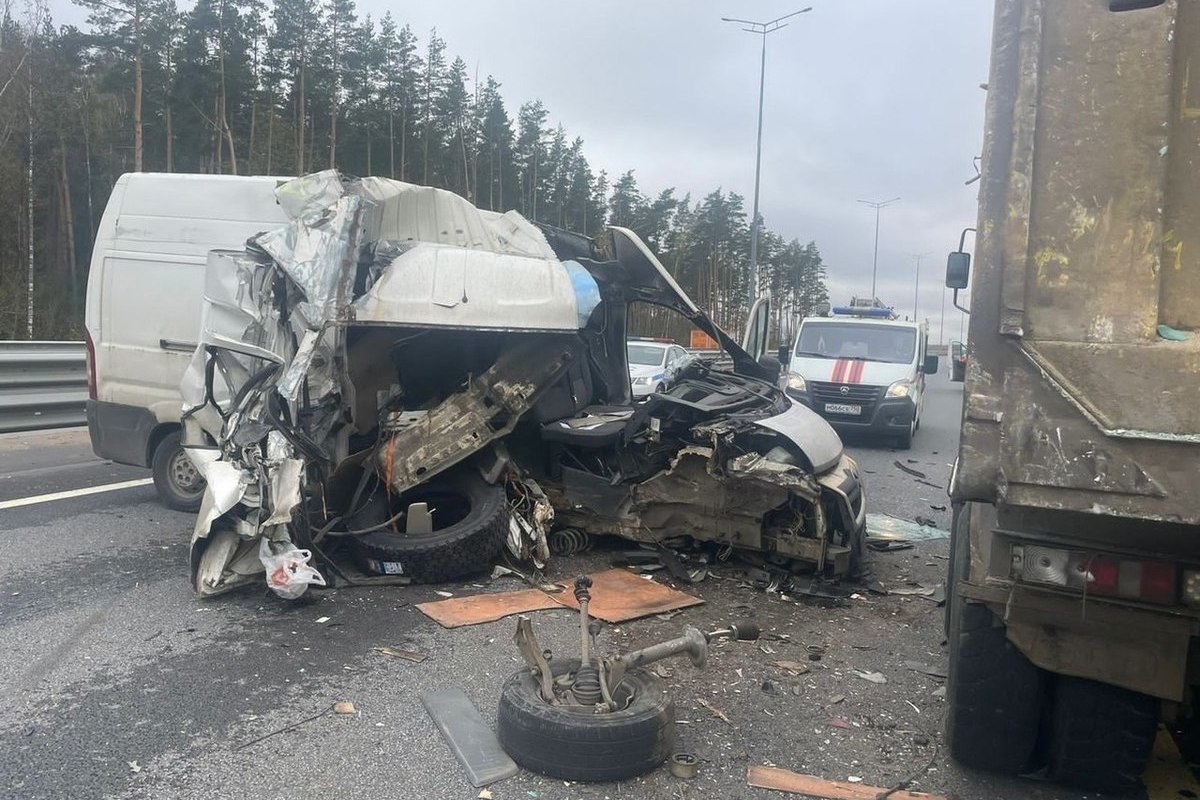 Страшное ДТП на ЦКАД в Подмосковье. Автомобиль Peugeot Boxer врезался в самосвал. Авария произошла на 197 километре трассы, недалеко от Домодедово.