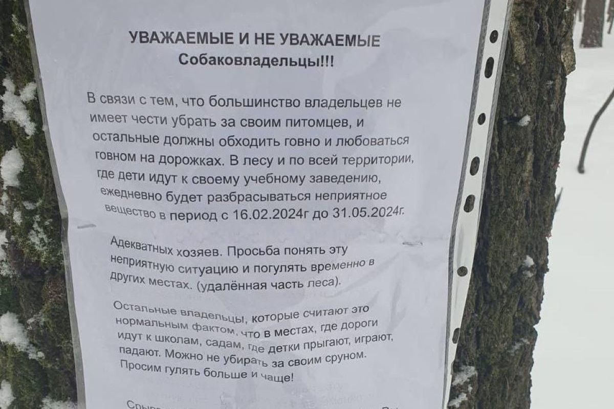 Затем автор пообещал раскладывать на территории лесопарка «неприятное вещество» в период до 31 мая сего года. Адекватных владельцев собак он попросил выбрать для прогулок другое место. А тех, кто не убирает, призвал приводить питомцев сюда, на территорию, приправленную видимо отравой. Автор попросил не срывать объявление, чтоб не пострадали невиновные. Что делать тем, кто попросту не прочитал объявление и может потерять животное, никто не указал.