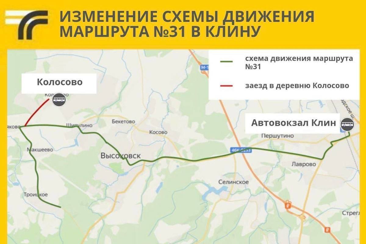 В городском округе Клин изменили автобусный маршрут №31. Все подробности об этом сообщает пресс-служба Минтранса Подмосковья.