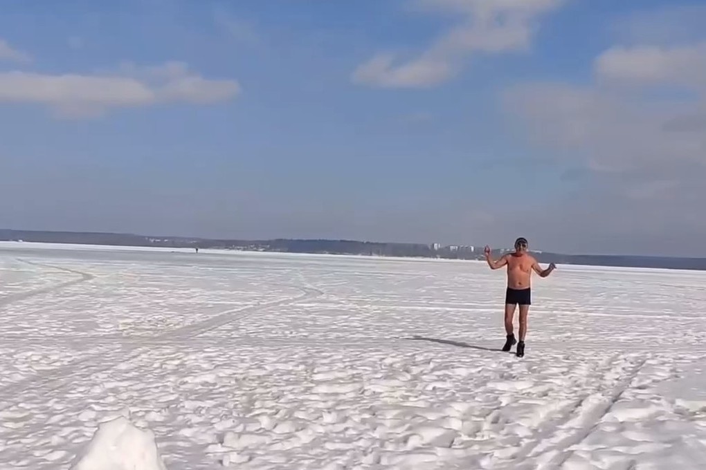 В соцсетях появилось видео, как обнаженный мужчина прогуливается по льду водоема. Таким образом он закаляется здесь регулярно.